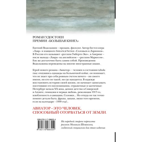 Евгений Водолазкин - прозаик, филолог. Автор. В России его называют "русским Умберто Эко", в Америке - после выхода "Лавра" на английском - "русским Маркесом". Ему же достаточно быть самим собой. Произведения Водолазкина переведены на многие иностранные языки. Новый роман лауреата премии "Большая книга", бестселлера "Лавр" и изящного historical fiction "Соловьев и Ларионов" Евгения Водолазкина "Авиатор" - яркое событие в литературе. Книга оценивается критиками как один самых ожидаемых русских романов 2016 года (по версии Forbes, Meduza и др.). Герой романа "Авиатор" - человек в состоянии tabula rasa: очнувшись однажды на больничной койке, он понимает, что не знает про себя ровным счётом ничего - ни своего имени, ни кто он такой, ни где находится. В надежде восстановить историю своей жизни, он начинает записывать посетившие его воспоминания, отрывочные и хаотичные: Петербург начала ХХ века, дачное детство в Сиверской и Алуште, гимназия и первая любовь, революция 1917-го, влюбленность в авиацию, Соловки…