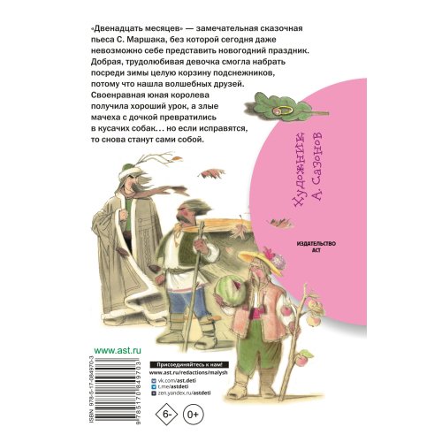Об этом юные читатели узнают в конце доброй сказки из этой книжки с яркими цветными иллюстрациями. Для... Читать полностью "Двенадцать месяцев" - замечательная сказочная пьеса С. Маршака, без которой новогодний праздник сегодня даже представить себе невозможно. Добрая, трудолюбивая девочка смогла набрать целую корзину подснежников посреди зимы, потому что нашла волшебных друзей. Своенравная юная королева получила хороший урок, а злые мачеха с дочкой превратились в кусачих собак…