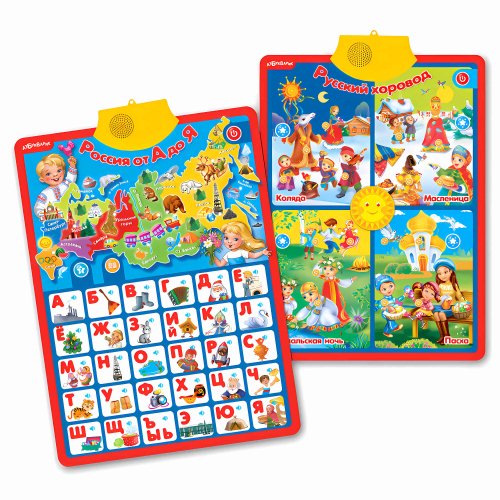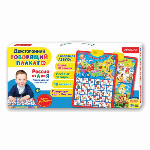 Этот двусторонний плакат – отличный вариант для знакомства с Россией и её праздниками. Более 50 звуков, весёлые загадки, 18 песенок, говорящие азбука и карта России – всё это приведет малышей в восторг!