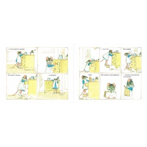 Однажды Селестина обнаружила в ящике комода конверт с фотографиями. На них молодой Эрнест был изображен в кругу незнакомых ей белых мышек… "Как же так? Кто они?" - недоумевала Селестина. "Почему Эрнест хранит эти фотографии и почему среди них нет ни одного снимка самой Селестины? Неужели ее он любит меньше, чем тех белых мышек?" Все объяснилось просто: в молодости Эрнест работал воспитателем в летнем лагере, где и были сделаны снимки. А чтобы у них с Селестиной тоже были общие фото на память - они нарядились и отправились в самое шикарное фотоателье в городе!