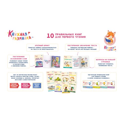 Серия "Книжная разминка" - это…тщательно проработанная, эффективная методика, основанная на исследованиях в области психологии и обучения чтению, учитывается практический опыт родителей и педагогов, естественное развитие навыка чтения благодаря постепенному усложнению материала, без стресса для ребёнка и потраченных нервов родителей, специально разработанные для этой методики авторские тексты и иллюстрации, крупный шрифт, развитие техники и увеличение объёма чтения (3 уровня сложности слов в каждой книги + 3 уровня сложности книг), скрытые весёлые задания на понимание текста (ребёнок не догадается, что его проверяют, а вы сможете увидеть прогресс), увлекательные истории с интересным и понятным малышу сюжетом, простые и понятные рекомендации на каждый день - как помочь малышу полюбить читать.