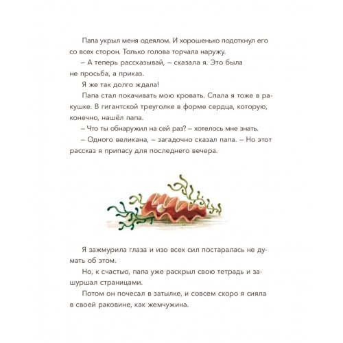 "Лилия живет в маяке, у нее важная работа: следить, чтобы не погасло северное сияние. Ее папы почти никогда не бывает дома, потому что он исследует море. Из каждой экспедиции он привозит для Лилии морскую ракушку, и у нее собралась уже целая коллекция. Однажды папа рассказал ей об одном ките, который всегда плавает в одиночестве. Другие киты его не слышат. Когда Лилия остается одна, на маяке становится совсем тихо. Но вдруг из одной ракушки слышится чья-то песня. Может, это тот самый кит? И может быть, он поет для Лилии? "