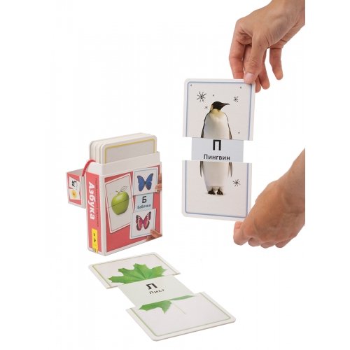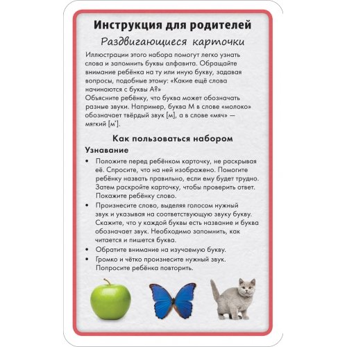 Набор включает 15 двусторонних развивающих карточек из плотного белого мелованного картона и цветной вкладыш с инструкцией для родителей с интересными заданиями для ребёнка. Каждая карточка раздвигается вверх-вниз, открывая спрятанную внутри картинку по теме.