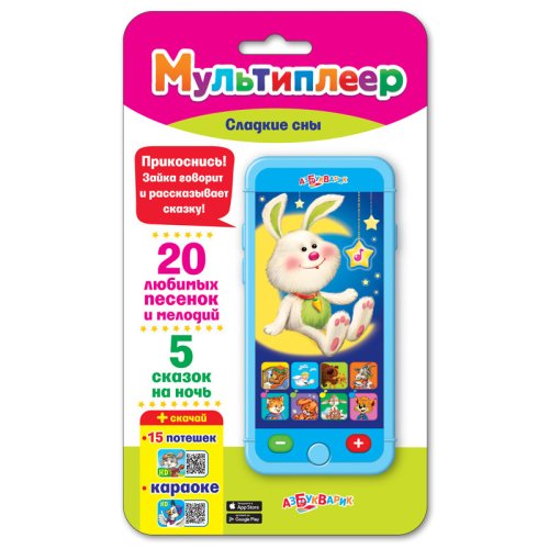 Этот волшебный мультиплеер поможет малышам заснуть! Перед сном ребёнок сможет послушать 20 любимых песенок ("Гули-гуленьки", "Спи, моя радость, усни", "Баю-баюшки-баю" и другие) и 5 добрых сказок ("Верное средство", "Гуси-лебеди", "Бычок - смоляной бочок", "Коза-дереза", "Заюшкина избушка"). Особенным плюсом для родителей будет наличие кнопочек для регулировки громкости песен.Бонус! Отсканируй QR-коды на упаковке - скачай бесплатно интерактивные книги в приложении "Азбукварик".Упаковка: блистер.Размер упаковки: 140х230х20 мм.Размер игрушки: 70х140 мм.